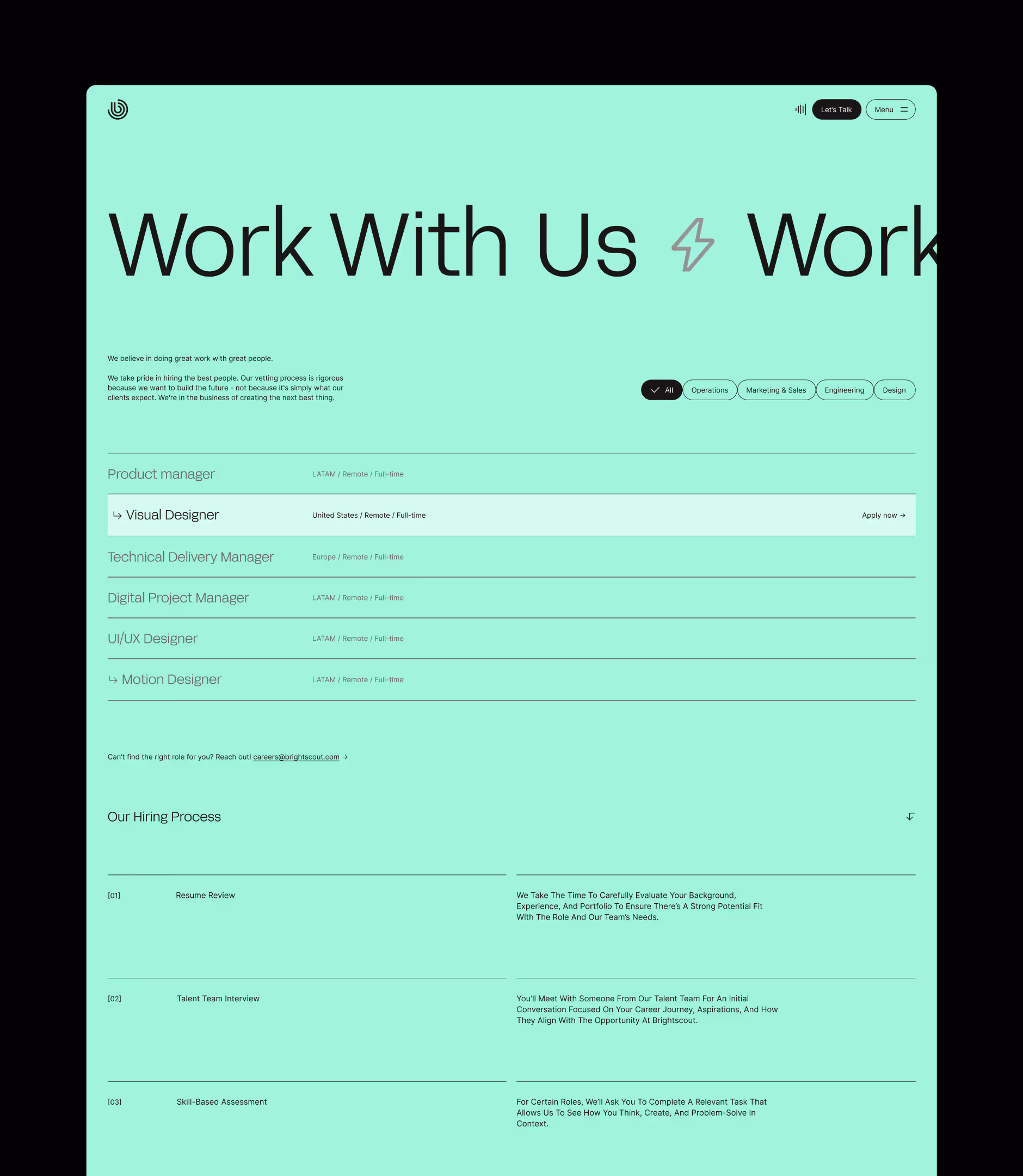BRIGHTSCOUT is a design and development agency that partners with B2B, SaaS, and emerging tech companies to build memorable brand identities and high-performing digital experiences. With a strong focus on strategy, execution, and innovation, the agency blends branding, UI/UX design, and engineering to help companies scale with clarity and confidence.